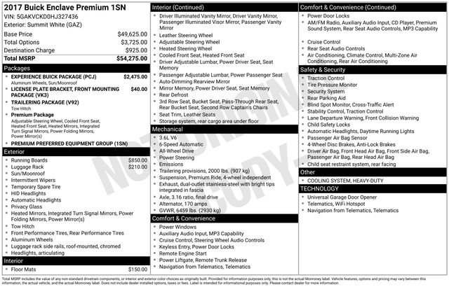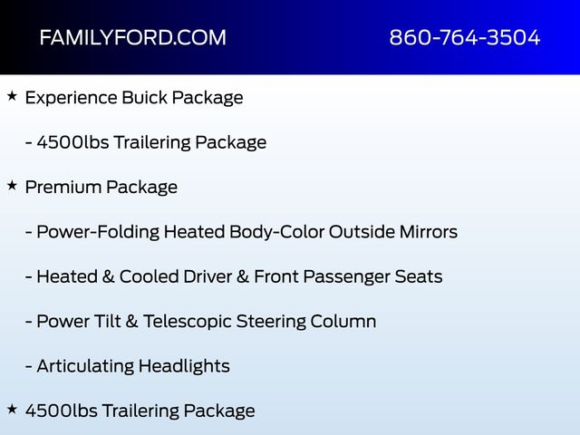 3.16 Axle Ratio, 4500lbs Trailering Package, ABS brakes, Articulating Headlights, Automatic temperature control, Bose Performance-Enhanced 10-Speaker System, Bose Sound System, Delay-off headlights, Experience Buick Package, Exterior Parking Camera Rear, Forward Collision Alert & Lane Departure Warning, Front dual zone A/C, Fully automatic headlights, Heated & Cooled Driver & Front Passenger Seats, Heated door mirrors, Heated front seats, Heated steering wheel, Heavy-Duty Cooling System, High intensity discharge headlights: Bi-Xenon, Illuminated entry, Memory seat, Navigation System, Panic alarm, Perforated Leather-Appointed Seat Trim, Power door mirrors, Power driver seat, Power Liftgate, Power passenger seat, Power Tilt & Telescopic Steering Column, Power Tilt-Sliding Moonroof, Power windows, Power-Folding Heated Body-Color Outside Mirrors, Preferred Equipment Group 1SN, Premium Package, Rear Audio System Controls, Rear Parking Sensors, Remote keyless entry, Security system, Trailer Hitch, Turn signal indicator mirrors, Ventilated front seats, Wheels: 20" Bright-Machined Aluminum.
