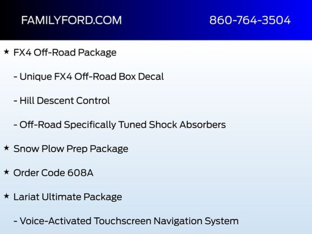 110V/400W Outlet, 6" Angular Chrome Step Bars, Adjustable pedals, Ambient Lighting - Fixed Color, Auto High-beam Headlights, Automatic temperature control, Body-Color Door Handles w/Chrome Insert, Chrome Exhaust Tip, Chrome Package, Delay-off headlights, Easy Entry®/Exit Memory Driver's Seat Feature, Front dual zone A/C, Fully automatic headlights, FX4 Off-Road Package, GVWR: 10,000 lb Payload Package, Heated door mirrors, Hill Descent Control, Illuminated entry, Intelligent Access w/Push-Button Start, Lariat Ultimate Package, LED Box Lighting, LED Roof Clearance Lights, Memory Power-Adjustable Pedals, Off-Road Specifically Tuned Shock Absorbers, Order Code 608A, Panic alarm, Power door mirrors, Power driver seat, Power Heated/Ventilated Driver Seat w/Memory, Power Heated/Ventilated Passenger Seat, Power passenger seat, Power Telescoping/Tilt Steering Wheel/Column, PowerScope Trailer Tow Mirrors w/Heat, PowerScope Trailer Tow Mirrors w/Memory, Quad Beam LED Headlamps & LED Taillamps, Remote Start