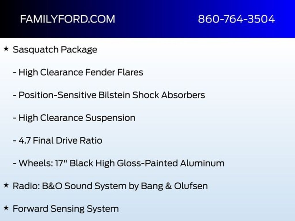 12" LCD Capacitive Touchscreen w/Swipe Capability, 2 Smart Charging USB Ports In Dashboard, 360-Degree Camera, 4.7 Final Drive Ratio, ABS brakes, Adaptive Cruise Control, Additional Sound Deadening, Auto High-beam Headlights, BLIS Blind Spot Information System, Compass, Connected Built-In Navigation, Delay-off headlights, Equipment Group 354A Lux Package, Evasive Steering Assist, Exterior Parking Camera Rear, Forward Sensing System, Fully automatic headlights, Heated door mirrors, Heated front seats, Heated Steering Wheel, High Clearance Fender Flares, High Clearance Suspension, Illuminated entry, Information on Demand Panel, Low tire pressure warning, Position-Sensitive Bilstein Shock Absorbers, Power door mirrors, Pre-Collision Assist w/Automatic Emergency Braking, Radio: B&O Sound System by Bang & Olufsen, Remote keyless entry, Reverse Sensing System, Sasquatch Package, Security system, Sideview Mirrors, Traction control, Universal Garage Door Opener, Wheels: 17" Black High Gloss-Painted Aluminum, Wireless Charging Pad.