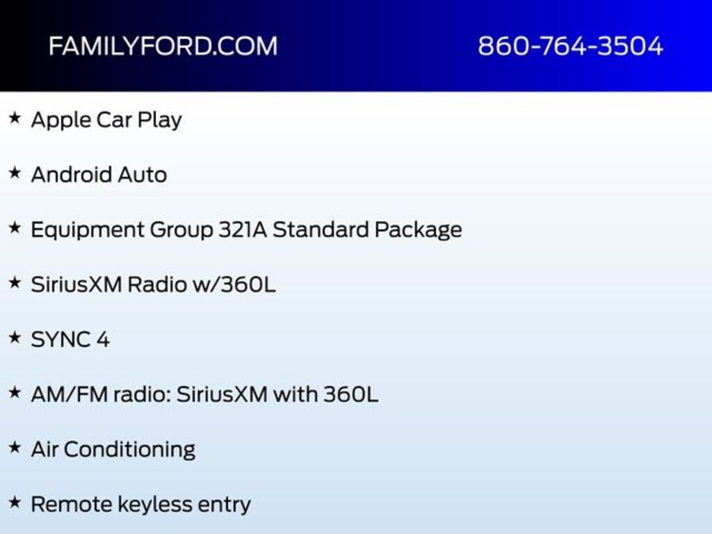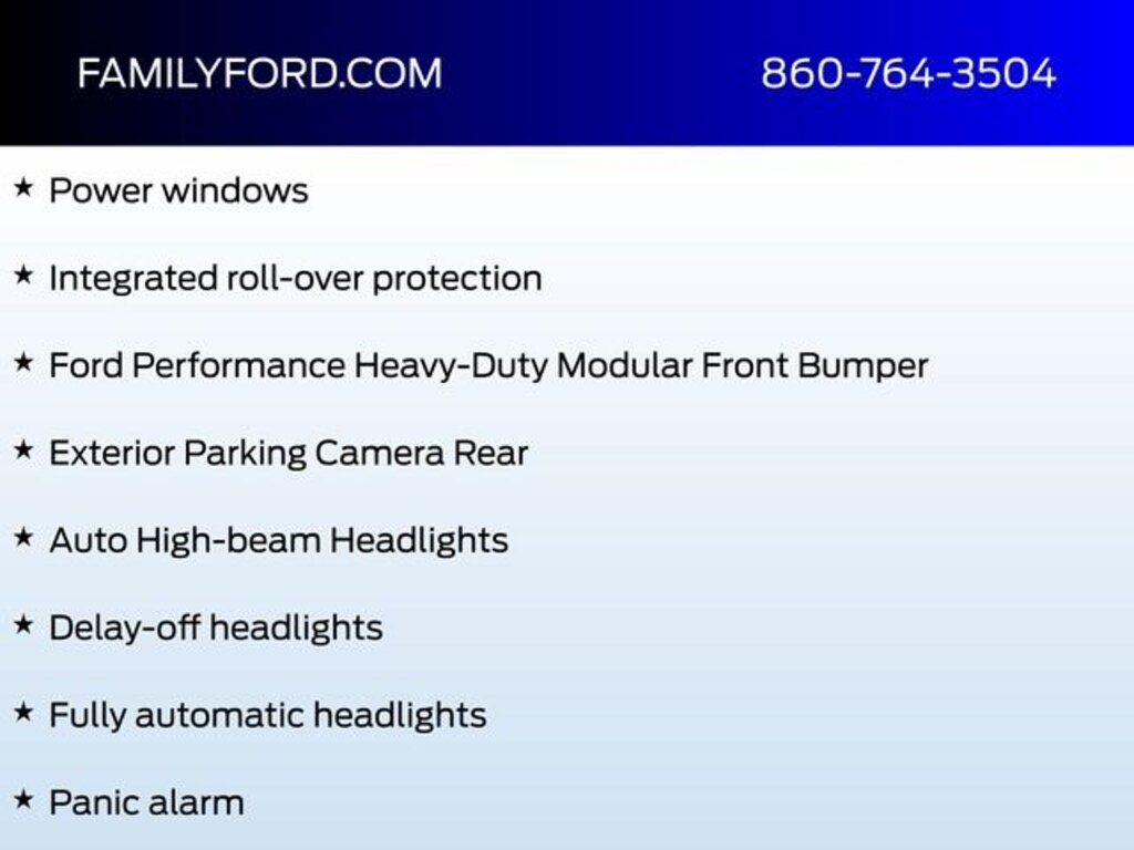 Apple Car Play, Android Auto, Air Conditioning, AM/FM radio: SiriusXM with 360L, Auto High-beam Headlights, Delay-off headlights, Equipment Group 321A Standard Package, Exterior Parking Camera Rear, Ford Performance Heavy-Duty Modular Front Bumper, Front Bucket Seats, Fully automatic headlights, Heated door mirrors, Illuminated entry, Integrated roll-over protection, Panic alarm, Power door mirrors, Power windows, Remote keyless entry, Security system, SiriusXM Radio w/360L, Speed control, SYNC 4, Telescoping steering wheel, Tilt steering wheel, Wheels: 17" Black Gloss-Painted Steel.