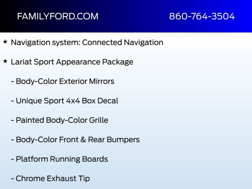 397 Amp Alternator, Air Conditioning, Ambient Lighting - Fixed Color, Auto High-beam Headlights, Automatic temperature control, Body-Color Exterior Mirrors, Body-Color Front & Rear Bumpers, Chrome Exhaust Tip, Delay-off headlights, Easy Entry®/Exit Memory Driver's Seat Feature, Engine Block Heater, Exterior Parking Camera Rear, Front dual zone A/C, Fully automatic headlights, GVWR: 10,000 lb Payload Package, Heated door mirrors, Heated Rear Seats, Heated Steering Wheel, High Capacity Trailer Tow Package, Illuminated entry, Intelligent Access w/Push-Button Start, Lane Departure Warning System, Lariat Sport Appearance Package, Lariat Ultimate Package, LED Box Lighting, LED Roof Clearance Lights, Memory Power-Adjustable Pedals, Navigation system: Connected Navigation, Painted Body-Color Grille, Platform Running Boards, Power driver seat, Power Heated/Ventilated Driver Seat w/Memory, Power Heated/Ventilated Passenger Seat, Power passenger seat, Power Telescoping/Tilt Steering Wheel/Column, PowerScope Trailer Tow Mirrors w/Memory, Pro Trailer Backup Assist - High Capacity, Radio: B&O Sound System by Bang & Olufsen, Rain-Sensing Windshield Wipers, Rear Parking Sensors, Remote Start System, Remote Tailgate Release, Security system, SiriusXM Radio w/360L, Speed control, SYNC 4 w/Enhanced Voice Recognition, Tailgate Step & Handle, Twin Panel Power Moonroof, Ultimate Trailer Tow Camera System, Unique Sport 4x4 Box Decal, Universal Garage Door Opener (UGDO), Upfitter Switches (6), Wheels: 18" Bright Machined Cast Aluminum.