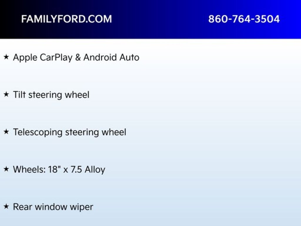 6 Speakers, Air Conditioning, Apple CarPlay & Android Auto, Brake assist, Delay-off headlights, Electronic Stability Control, Exterior Parking Camera Rear, Front fog lights, Fully automatic headlights, Power door mirrors, Power windows, Radio: AM/FM/MP3 Audio System, Rear window defroster, Rear window wiper, Remote keyless entry, Speed control, Speed-sensing steering, Steering wheel mounted audio controls, Telescoping steering wheel, Tilt steering wheel, Wheels: 18" x 7.5 Alloy.