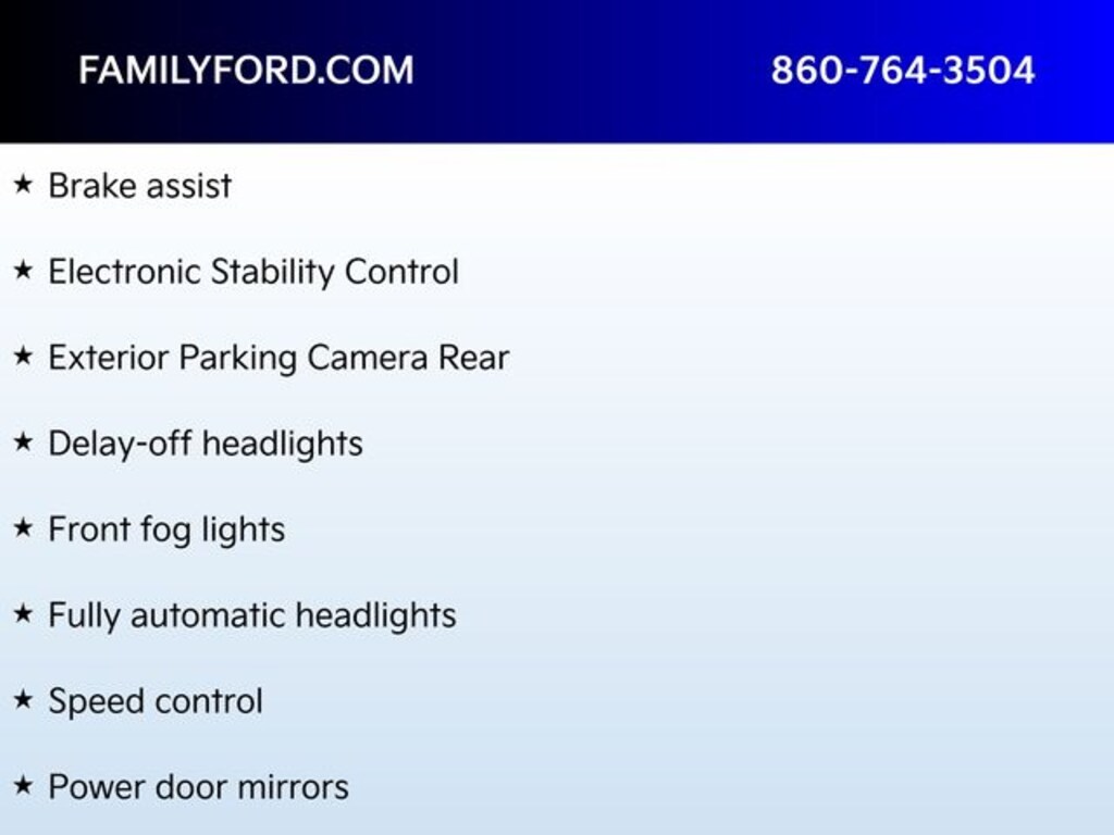 Safety & Convenience: Exterior parking camera (rear), electronic stability control, brake assist, front fog lights, fully automatic headlights, delay-off headlights, remote keyless entry, rear window defroster and wiper