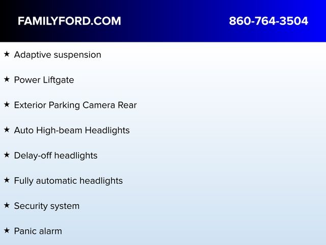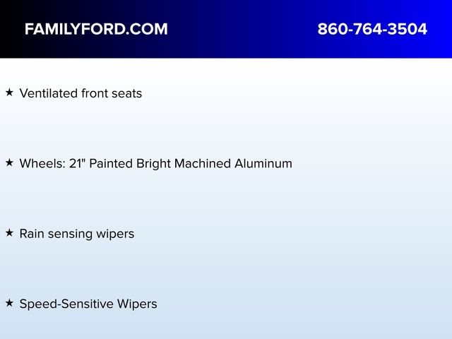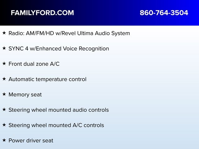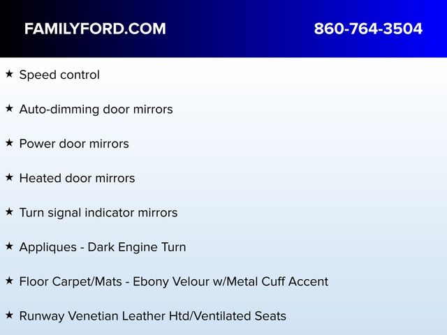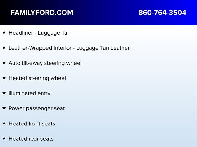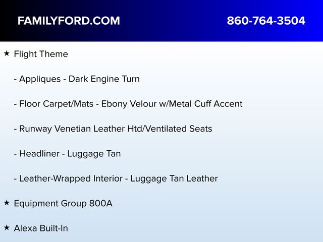Adaptive suspension, Alexa Built-In, Appliques - Dark Engine Turn, Auto High-beam Headlights, Auto tilt-away steering wheel, Auto-dimming door mirrors, Automatic temperature control, Delay-off headlights, Equipment Group 800A, Exterior Parking Camera Rear, Flight Theme, Floor Carpet/Mats - Ebony Velour w/Metal Cuff Accent, Front dual zone A/C, Fully automatic headlights, Headliner - Luggage Tan, Heated door mirrors, Heated front seats, Heated rear seats, Heated steering wheel, Illuminated entry, Leather-Wrapped Interior - Luggage Tan Leather, Memory seat, Panic alarm, Power door mirrors, Power driver seat, Power Liftgate, Power passenger seat, Radio: AM/FM/HD w/Revel Ultima Audio System, Rain sensing wipers, Runway Venetian Leather Htd/Ventilated Seats, Security system, Speed control, Speed-Sensitive Wipers, Steering wheel mounted A/C controls, Steering wheel mounted audio controls, SYNC 4 w/Enhanced Voice Recognition, Turn signal indicator mirrors, Ventilated front seats, Wheels: 21" Painted Bright Machined Aluminum.