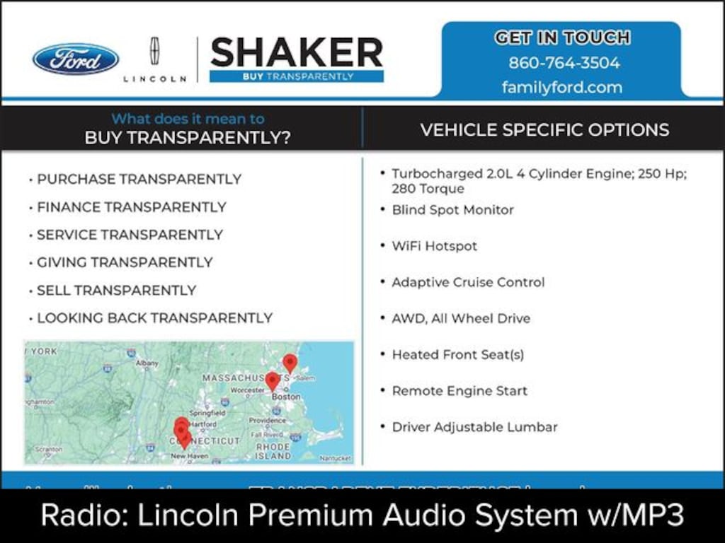 18" Bright Machined Aluminum Wheels, 360-Degree Camera, 60/40 EasyFold Rear Seat w/Power Seatback Release, Auto High-beam Headlights, Automatic temperature control, Equipment Group 101A, Four wheel independent suspension, Frameless Auto Dimming Rearview Mirror, Front dual zone A/C, Fully automatic headlights, Hands-Free Liftgate, Heated front seats, Heated Sideview Mirrors, Heated Steering Wheel, Heated/Ventilated Driver & Front Passenger Seats, Illuminated entry, Leather steering wheel, Memory seat, Micro-Perforated Lincoln Soft Touch Seats, Navigation system: Connected Navigation (3-year trial), Panic alarm, Phone As A Key (PAAK), Power door mirrors, Power driver seat, Power Liftgate, Power steering, Power Tilt/Telescoping Steering Column w/Memory, Power windows, Radio: Lincoln Premium Audio System w/MP3, Rain Sensing Wipers, Rear Parking Sensors, Remote keyless entry, Reverse Brake Assist, Security system, SiriusXM Radio, Speed control, Speed-Sensitive Wipers, SYNC 4 Communications & Entertainment System, Universal Garage Door Opener, Windshield Wiper De-Icer, Wireless Charging Pad.