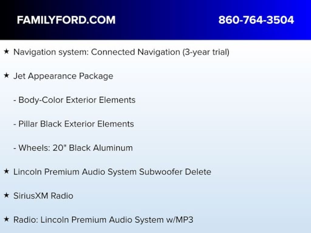3.81 Axle Ratio, 360-Degree Camera, Air Conditioning, Auto High-beam Headlights, Body-Color Exterior Elements, Fully automatic headlights, Hands-Free Liftgate, Heated door mirrors, Heated front seats, Heated Steering Wheel, Heated/Ventilated Driver & Front Passenger Seats, Illuminated entry, Jet Appearance Package, Lincoln Premium Audio System Subwoofer Delete, Memory seat, Navigation system: Connected Navigation (3-year trial), Pillar Black Exterior Elements, Power driver seat, Power Liftgate, Radio: Lincoln Premium Audio System w/MP3, Rain Sensing Wipers, Rear Parking Sensors, Reverse Brake Assist, SiriusXM Radio, Speed control, Star Light Metallic Applique, SYNC 4 Communications & Entertainment System, Wheels: 20" Black Aluminum.