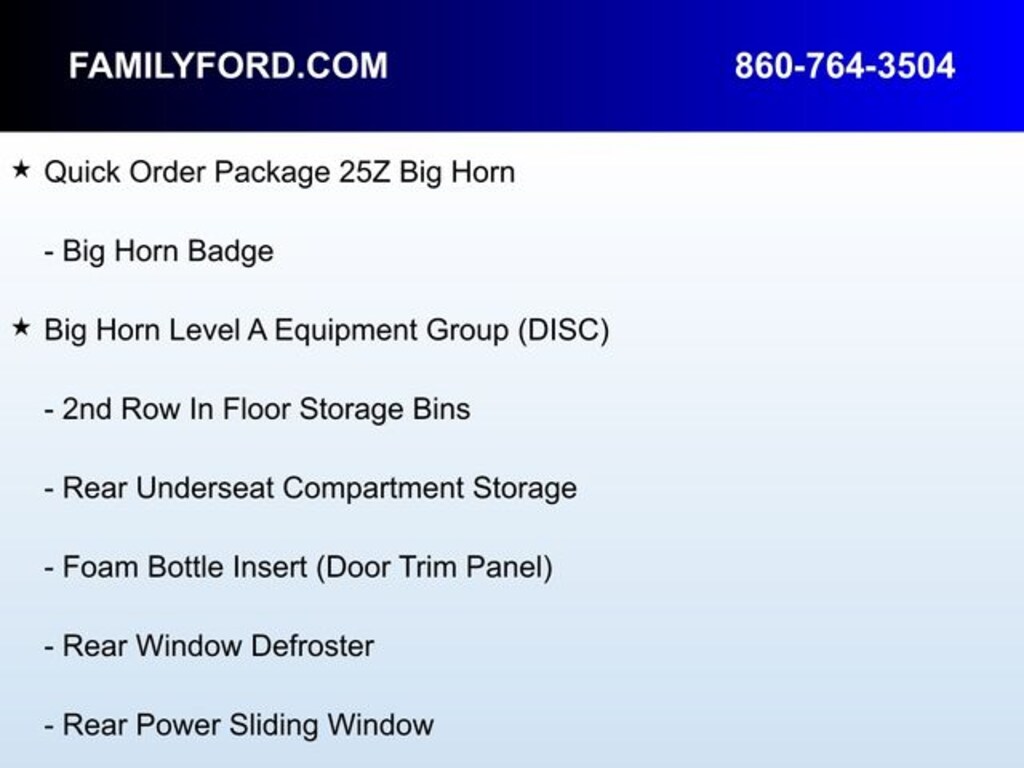 2nd Row In Floor Storage Bins, 3.21 Rear Axle Ratio, 4G LTE Wi-Fi Hot Spot, 8.4" Touchscreen Display, Air Conditioning, Apple CarPlay, Auto-Dimming Exterior Driver Mirror, Auto-Dimming Rear-View Mirror, Bed Utility Group, Big Horn Badge, Big Horn Level A Equipment Group (DISC), Black Premium Power Mirrors (GUL), Bluetooth Handsfree Phone & Audio, Class IV Receiver Hitch, Cluster 3.5" TFT Color Display, Connectivity - US/Canada, Delay-off headlights, Exterior Mirrors Courtesy Lamps, Exterior Mirrors w/Supplemental Signals, Foam Bottle Insert (Door Trim Panel), For More Info, Call 800-643-2112, Fully automatic headlights, Glove Box Lamp, Google Android Auto, Heated door mirrors, Heavy-Duty Engine Cooling, Illuminated entry, Integrated Center Stack Radio, Integrated Voice Command w/Bluetooth, Leather steering wheel, MOPAR 4 Adjustable Cargo Tie-Down Hooks, MOPAR Deployable Bed Step, MOPAR Spray In Bedliner, Panic alarm, ParkView Rear Back-Up Camera, Pick-Up Box Lighting, Power 2-Way Driver Lumbar Adjust, Power 8-Way Driver Seat, Power Adjustable Pedals, Power door mirrors, Quick Order Package 25Z Big Horn, Radio: Uconnect 5 W w/8.4" Display, Rear