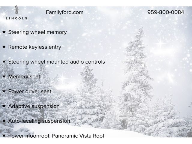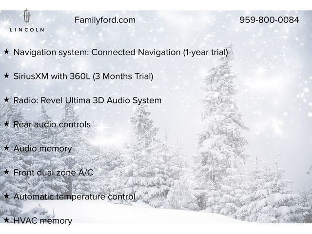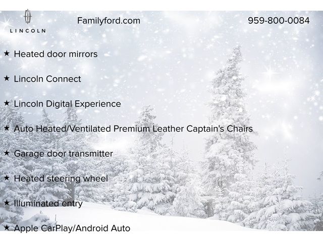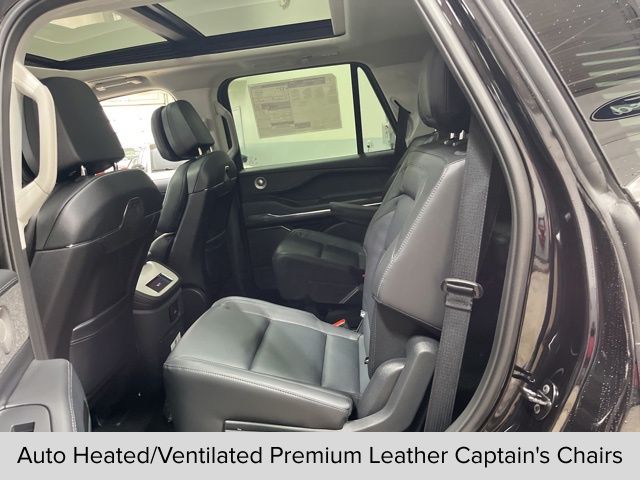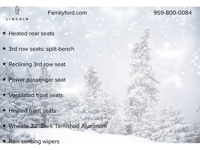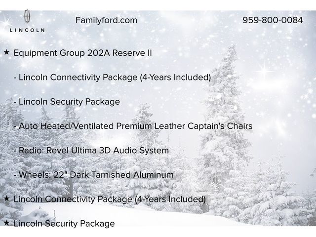3rd row seats: split-bench, Adaptive suspension, Apple CarPlay/Android Auto, Audio memory, Auto Heated/Ventilated Premium Leather Captain's Chairs, Auto High-beam Headlights, Auto-leveling suspension, Automatic temperature control, Delay-off headlights, Equipment Group 202A Reserve II, Exterior Parking Camera Rear, Front dual zone A/C, Fully automatic headlights, Garage door transmitter, Heated door mirrors, Heated front seats, Heated rear seats, Heated steering wheel, HVAC memory, Illuminated entry, Lincoln Connect, Lincoln Connectivity Package (4-Years Included), Lincoln Digital Experience, Lincoln Security Package, Memory seat, Navigation system: Connected Navigation (1-year trial), Panic alarm, Power door mirrors, Power driver seat, Power moonroof: Panoramic Vista Roof, Power passenger seat, Radio: Revel Ultima 3D Audio System, Rain sensing wipers, Rear audio controls, Reclining 3rd row seat, Remote keyless entry, Security system, SiriusXM with 360L (3 Months Trial), Speed control, Speed-Sensitive Wipers, Steering wheel memory, Steering wheel mounted audio controls, Ventilated front seats, Wheels: 22" Dark Tarnished Aluminum.