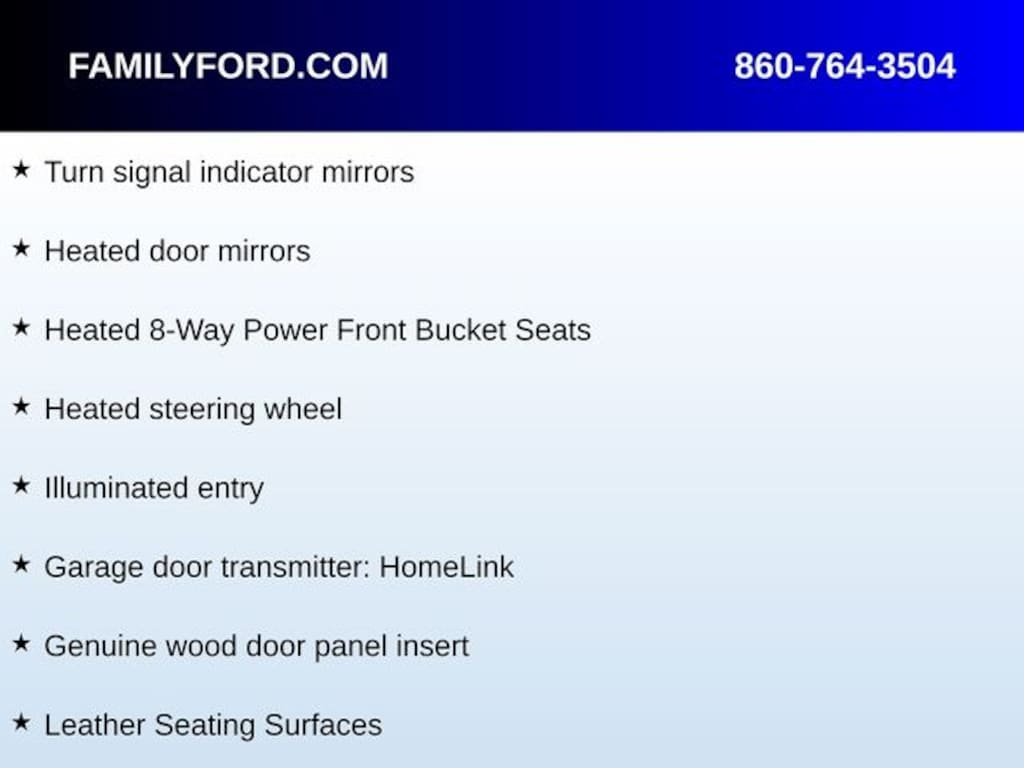 Interior & Comfort: Leather seating surfaces, heated 8-way power front bucket seats, heated steering wheel, genuine wood door panel inserts, automatic temperature control, front dual-zone A/C