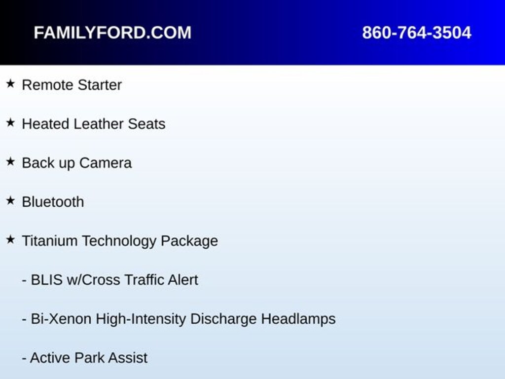 Remote Starter, Heated Leather Seats, Back up Camera, Bluetooth, 3.51 Axle Ratio, Active Park Assist, Bi-Xenon High-Intensity Discharge Headlamps, BLIS w/Cross Traffic Alert, Fully automatic headlights, Heated door mirrors, Heated front seats, Heated Leather-Trimmed Buckets w/60/40 Rear Seat, Illuminated entry, Memory seat, Panoramic Vista Roof, Power door mirrors, Power driver seat, Power Liftgate, Power steering, Power windows, Rain-Sensing Wipers, Security system, Speed control, SYNC 3 Communications & Entertainment System, Titanium Technology Package, Wheels: 18" Sparkle Nickel Painted Aluminum.