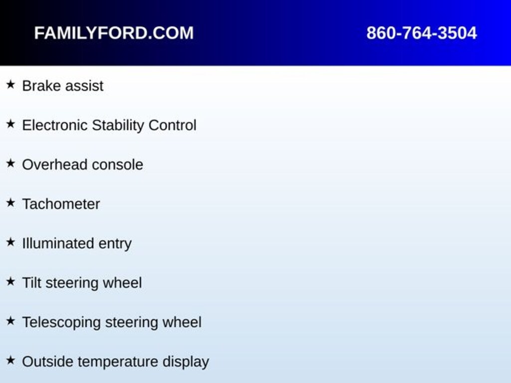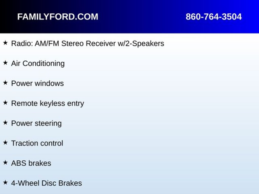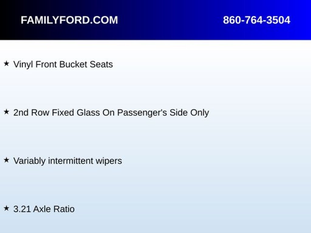 2nd Row Fixed Glass On Passenger's Side Only, 3.21 Axle Ratio, 4-Wheel Disc Brakes, ABS brakes, Air Conditioning, Brake assist, Electronic Stability Control, Illuminated entry, Outside temperature display, Overhead console, Power steering, Power windows, Radio: AM/FM Stereo Receiver w/2-Speakers, Remote keyless entry, Tachometer, Telescoping steering wheel, Tilt steering wheel, Traction control, Variably intermittent wipers, Vinyl Front Bucket Seats.