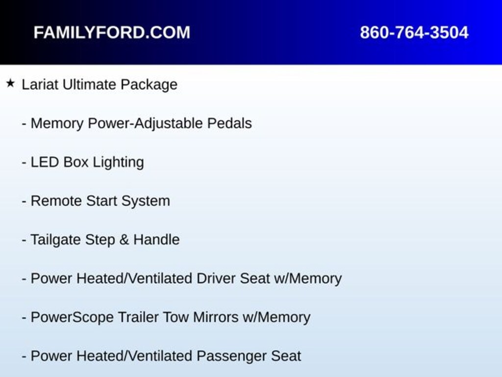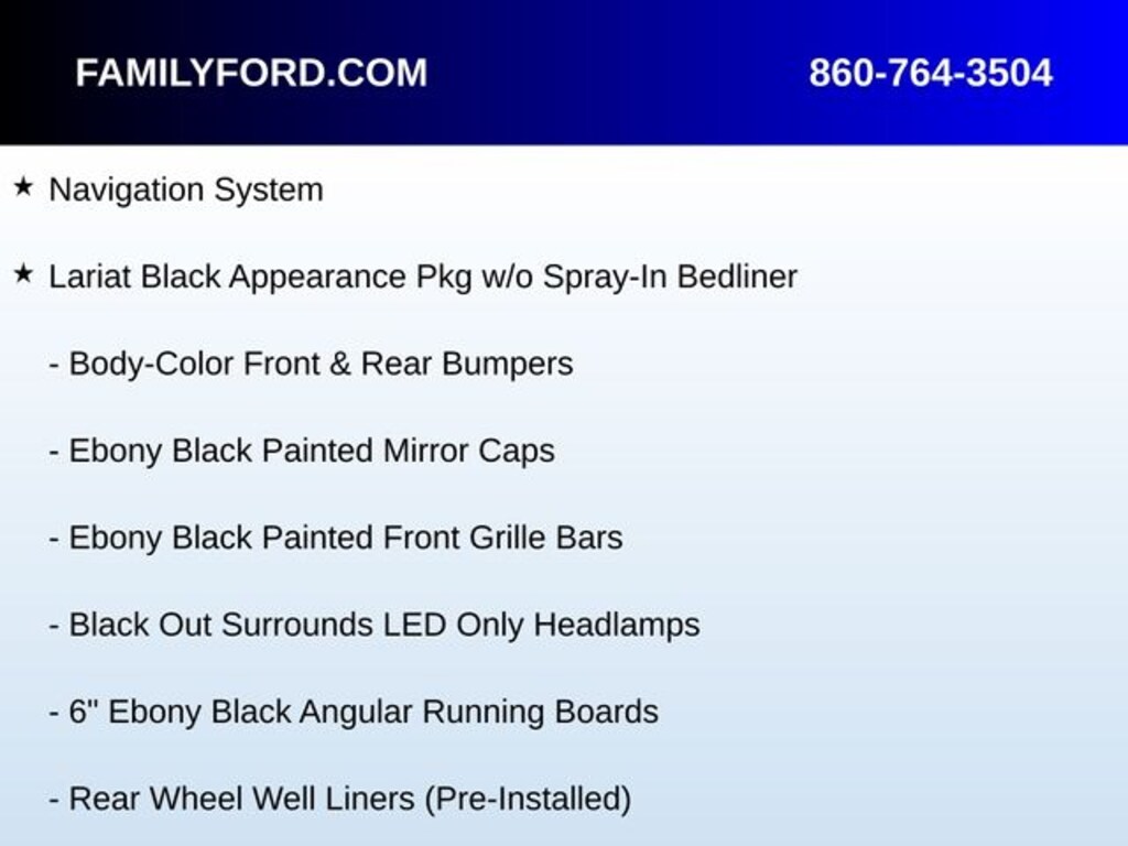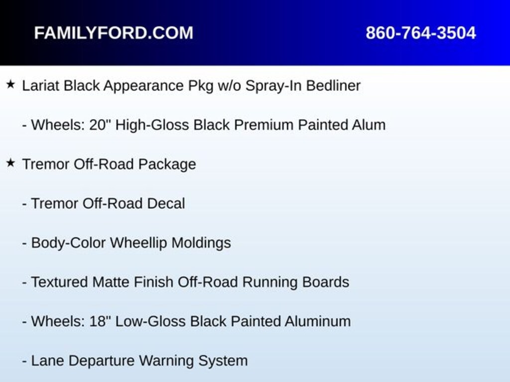 3.31 Axle Ratio, 6" Ebony Black Angular Running Boards, Ambient Lighting - Fixed Color, Auto High-beam Headlights, Automatic temperature control, Black Out Surrounds LED Only Headlamps, BLIS Blind Spot Information System, Body-Color Front & Rear Bumpers, Body-Color Wheellip Moldings, Delay-off headlights, Easy Entry®/Exit Memory Driver's Seat Feature, Ebony Black Painted Front Grille Bars, Ebony Black Painted Mirror Caps, Exterior Parking Camera Rear, Front dual zone A/C, Fully automatic headlights, Heated Rear Seats, Heated steering wheel, Intelligent Access w/Push-Button Start, Lane Departure Warning System, Lariat Black Appearance Pkg w/o Spray-In Bedliner, Lariat Ultimate Package, LED Box Lighting, Memory Power-Adjustable Pedals, Memory seat, Navigation System, Pedal memory, Power driver seat, Power Heated/Ventilated Driver Seat w/Memory, Power Heated/Ventilated Passenger Seat, Power Telescoping/Tilt Steering Wheel/Column, PowerScope Trailer Tow Mirrors w/Memory, Radio: B&O Sound System by Bang & Olufsen, Rear Parking Sensors, Rear Wheel Well Liners (Pre-Installed), Remote Start System, Remote Tailgate Release, SiriusXM Radio w/360L, SYNC 4 w/Enhanced Voice Recognition, Tailgate Step & Handle, Textured Matte Finish Off-Road Running Boards, Tough Bed Spray-In Bedliner, Tremor Off-Road Decal, Tremor Off-Road Package, Twin Panel Power Moonroof, Ventilated front seats, Wheels: 20" High-Gloss Black Premium Painted Alum.