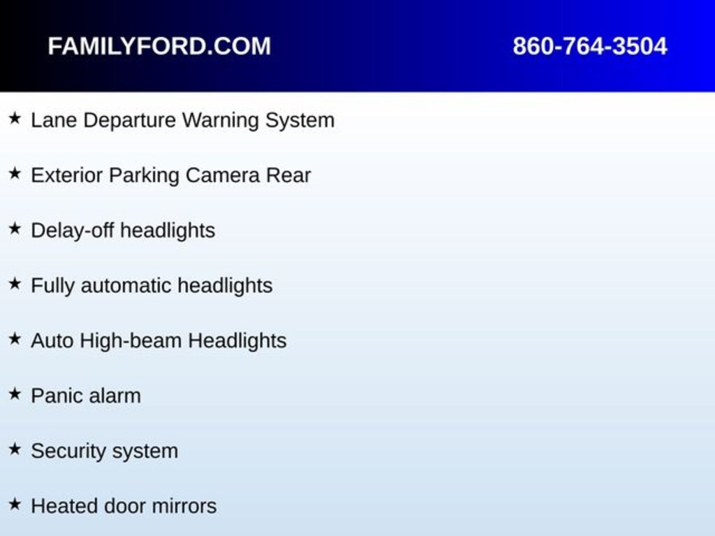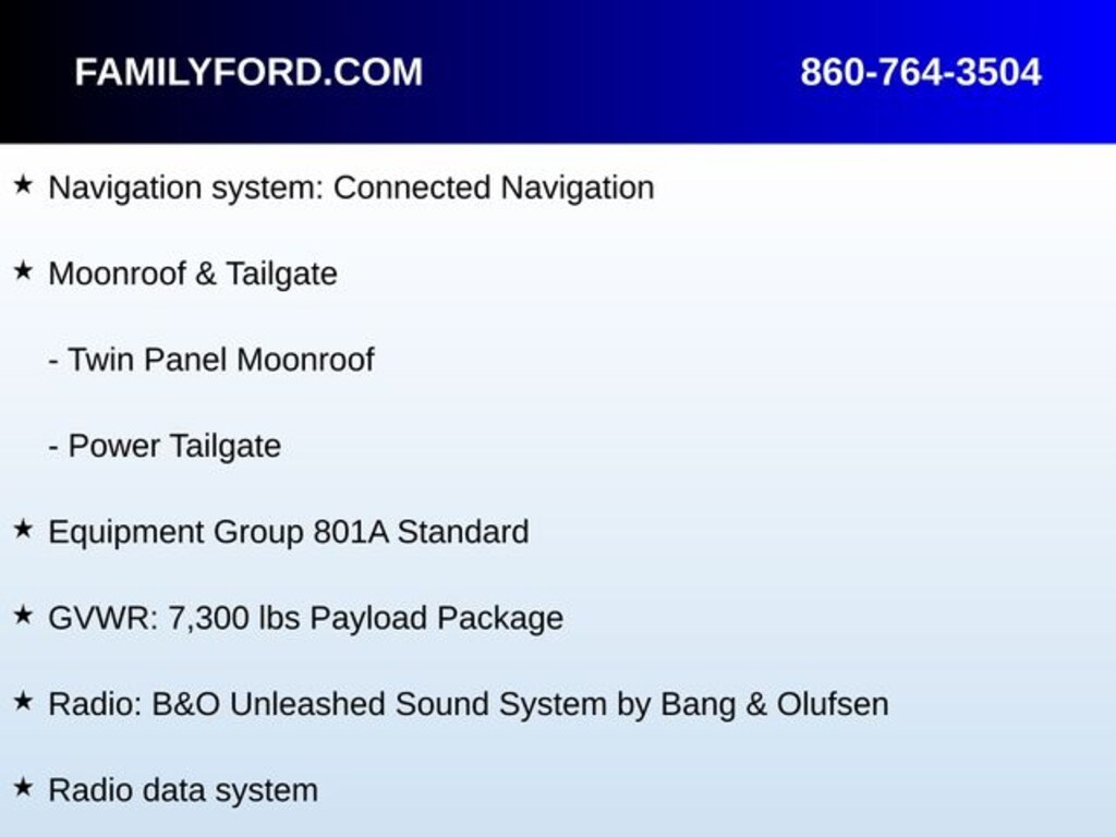 Adjustable pedals, Auto High-beam Headlights, Auto-dimming Rear-View mirror, Automatic temperature control, Delay-off headlights, Electronic Locking w/4.10 Axle Ratio, Equipment Group 801A Standard, Exterior Parking Camera Rear, Front dual zone A/C, Fully automatic headlights, Garage door transmitter, GVWR: 7,300 lbs Payload Package, Heated door mirrors, Heated front seats, Heated rear seats, Heated steering wheel, Lane Departure Warning System, Leather Trim Seats w/Heated 2nd Row, Memory seat, Moonroof & Tailgate, Navigation system: Connected Navigation, Panic alarm, Partitioned Lockable Fold-Flat Storage, Pedal memory, Power door mirrors, Power driver seat, Power passenger seat, Power Tailgate, Radio data system, Radio: B&O Unleashed Sound System by Bang & Olufsen, Rain sensing wipers, Security system, Split folding rear seat, SYNC 4 w/Enhanced Voice Recognition, Tough Bed Spray-In Bedliner, Twin Panel Moonroof, Ventilated front seats.