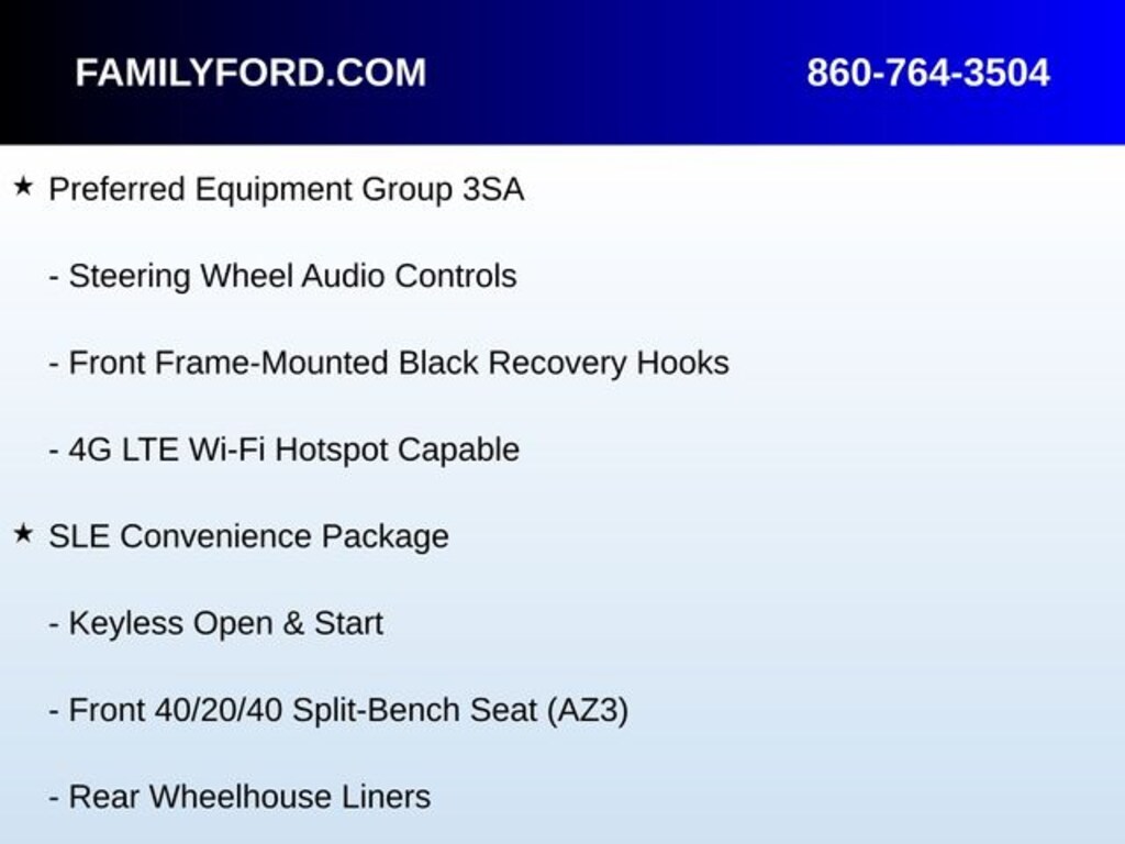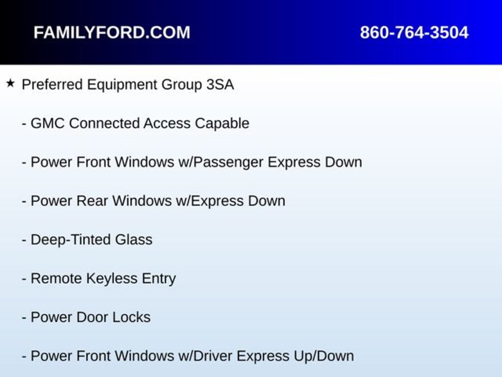10-Way Power Driver Seat Adjuster w/Lumbar, 12-Volt Rear Auxiliary Power Outlet, 220 Amp Alternator, 4G LTE Wi-Fi Hotspot Capable, Chrome Grille, Color-Keyed Carpeting Floor Covering, Compass, Deep-Tinted Glass, Delay-off headlights, Dual-Zone Automatic Climate Control, Electric Rear-Window Defogger, Electrical Lock Control Steering Column, Exterior Parking Camera Rear, EZ Lift Power Lock & Release Tailgate, Front 40/20/40 Split-Bench Seat (AZ3), Front Frame-Mounted Black Recovery Hooks, Front Rubberized-Vinyl Floor Mats, Fully automatic headlights, GMC Connected Access Capable, Heated Driver & Front Outboard Passenger Seating, Heated Steering Wheel, Heavy-Duty Rear Locking Differential, High-Capacity Air Filter, Hitch Guidance, Keyless Open & Start, LED Cargo Area Lighting, Manual Tilt Wheel Steering Column, Manual Tilt-Wheel & Telescoping Steering Column, OnStar & GMC Connected Services Capable, Power Door Locks, Power Front Windows w/Driver Express Up/Down, Power Front Windows w/Passenger Express Down, Power Rear Windows w/Express Down, Preferred Equipment Group 3SA, Rear Dual USB Charging-Only Ports, Rear Rubberized-Vinyl Floor Mats, Rear Wheelhouse Liners, Remote Keyless Entry, Remote Vehicle Starter System, Single-Zone Manual/Semi-Automatic Air Conditioning, SLE Convenience Package, SLE Value Package, Snow Plow Prep Package, Steering Wheel Audio Controls, Theft Deterrent System (Unauthorized Entry), Trailering Package.