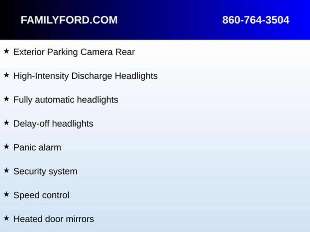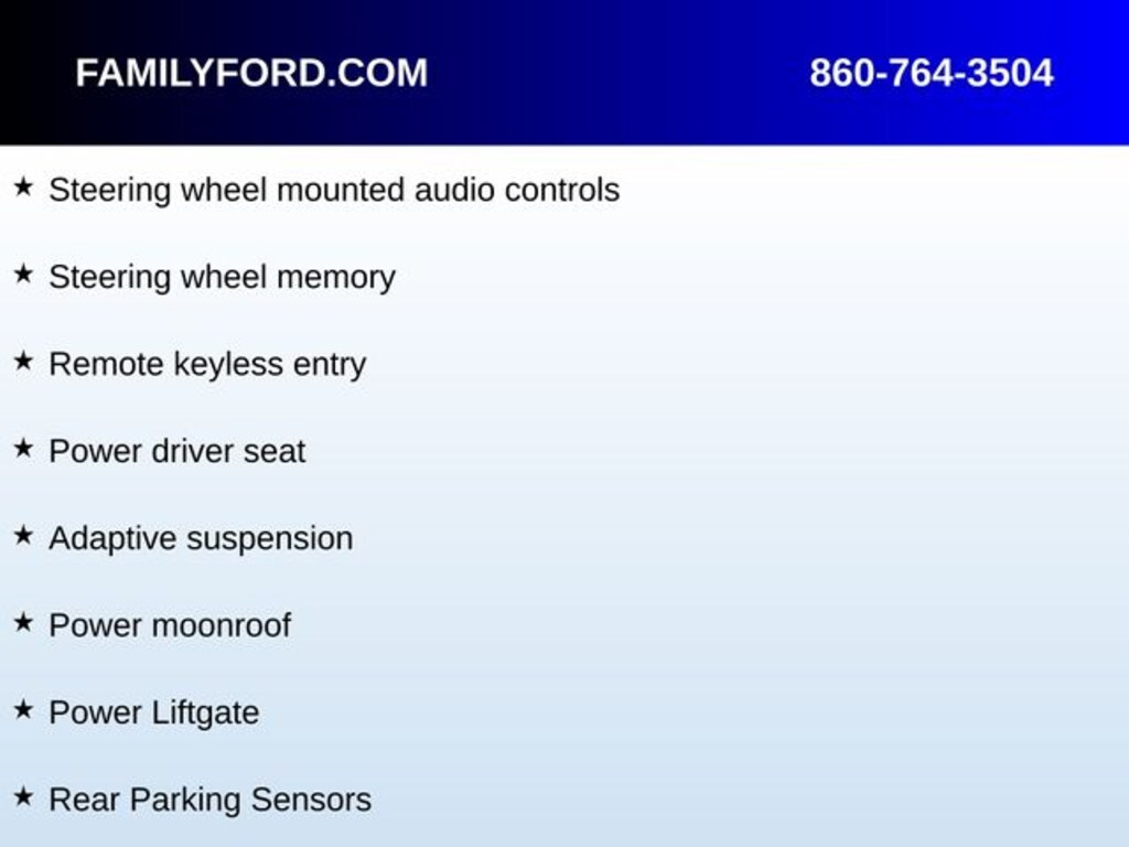 Adaptive suspension, Auto-dimming Rear-View mirror, Automatic temperature control, Class II Trailer Tow Package (3000 lbs), Delay-off headlights, Equipment Group 300A Reserve, Exterior Parking Camera Rear, Front dual zone A/C, Fully automatic headlights, Heated door mirrors, Heated front seats, High-Intensity Discharge Headlights, Illuminated entry, Memory seat, Navigation System, Panic alarm, Power door mirrors, Power driver seat, Power Liftgate, Power moonroof, Power passenger seat, Radio: Audio System w/CD/MP3/Navigation, Rear Parking Sensors, Remote keyless entry, Security system, SiriusXM Satellite Radio, Speed control, Speed-Sensitive Wipers, Steering wheel memory, Steering wheel mounted audio controls, SYNC 3 Communications & Entertainment System, Ventilated front seats, Wheels: 19" Premium Painted 5-Spoke Aluminum.