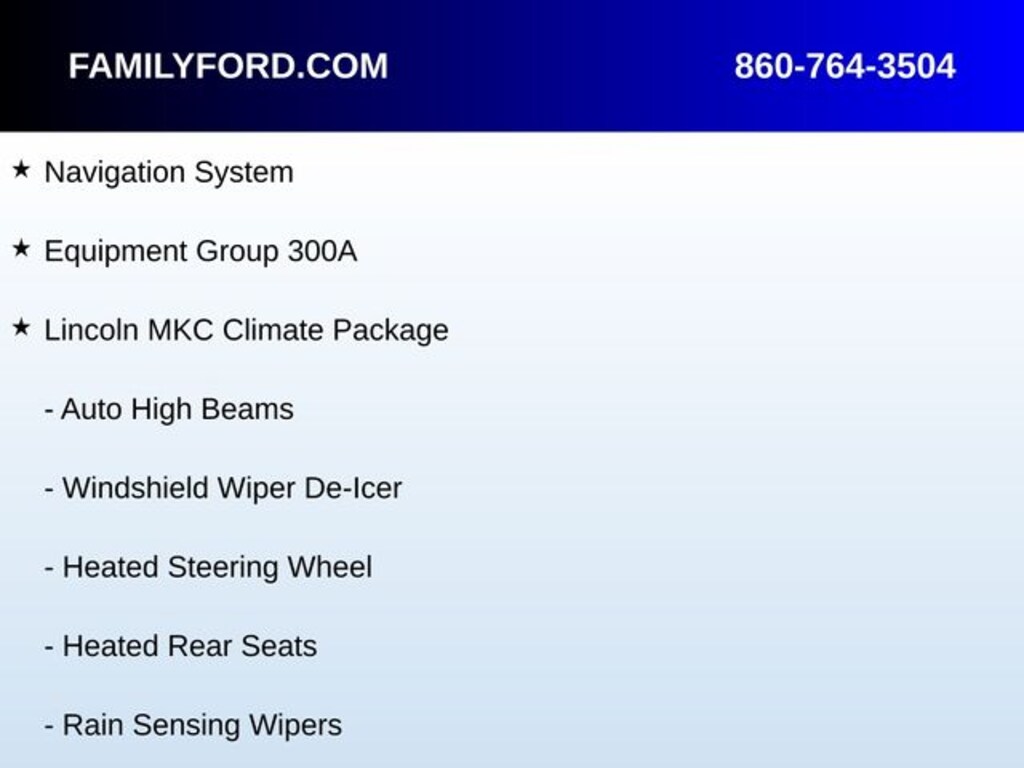 Auto High Beams, Automatic temperature control, Delay-off headlights, Equipment Group 300A, Exterior Parking Camera Rear, Front dual zone A/C, Front fog lights, Fully automatic headlights, Heated door mirrors, Heated front seats, Heated Rear Seats, Heated Steering Wheel, Lincoln MKC Climate Package, Memory seat, Navigation System, Power door mirrors, Power driver seat, Power Liftgate, Power moonroof: Vista Roof, Power passenger seat, Radio: Audio System w/Single CD/MP3/Navigation, Rain Sensing Wipers, SiriusXM Radio, Speed control, Speed-Sensitive Wipers, Steering wheel mounted audio controls, SYNC 3 Communications & Entertainment System, Ventilated front seats, Wheels: 19" Premium Painted 5-Spoke Aluminum, Windshield Wiper De-Icer.