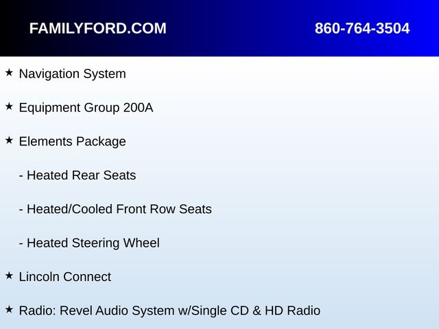 Adaptive suspension, AM/FM radio: SiriusXM, Auto High-beam Headlights, Auto-dimming door mirrors, Automatic temperature control, Delay-off headlights, Elements Package, Equipment Group 200A, Exterior Parking Camera Rear, Four wheel independent suspension, Front dual zone A/C, Fully automatic headlights, Garage door transmitter, Heated door mirrors, Heated front seats, Heated Rear Seats, Heated Steering Wheel, Heated/Cooled Front Row Seats, High-Intensity Discharge Headlights, Illuminated entry, Lincoln Connect, Memory seat, Navigation System, Panic alarm, Power door mirrors, Power driver seat, Power moonroof, Power passenger seat, Radio: Revel Audio System w/Single CD & HD Radio, Security system, Speed-Sensitive Wipers, SYNC 3 Communications & Entertainment System, Voice-Activated Touchscreen Navigation System, Wheels: 19" Satin Finish 7-Spoke Machined Aluminum.